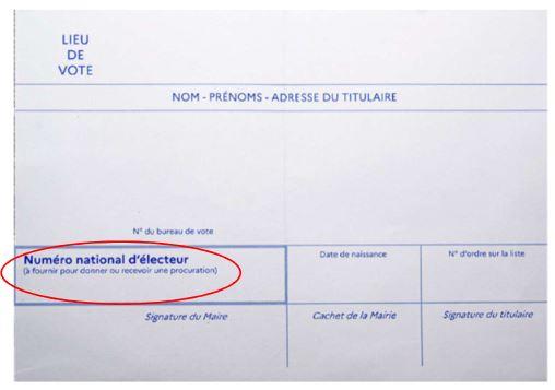 Ce numéro permanent, unique et propre à chaque électeur est composé de 8 ou 9 chiffres. Il figure sur la carte électorale :